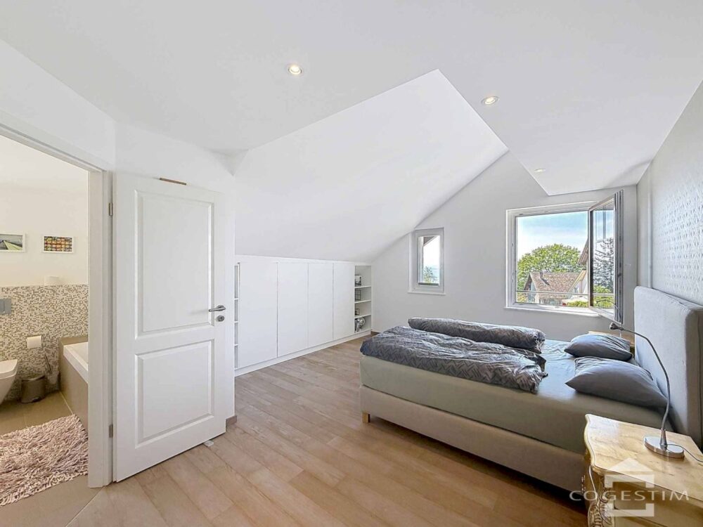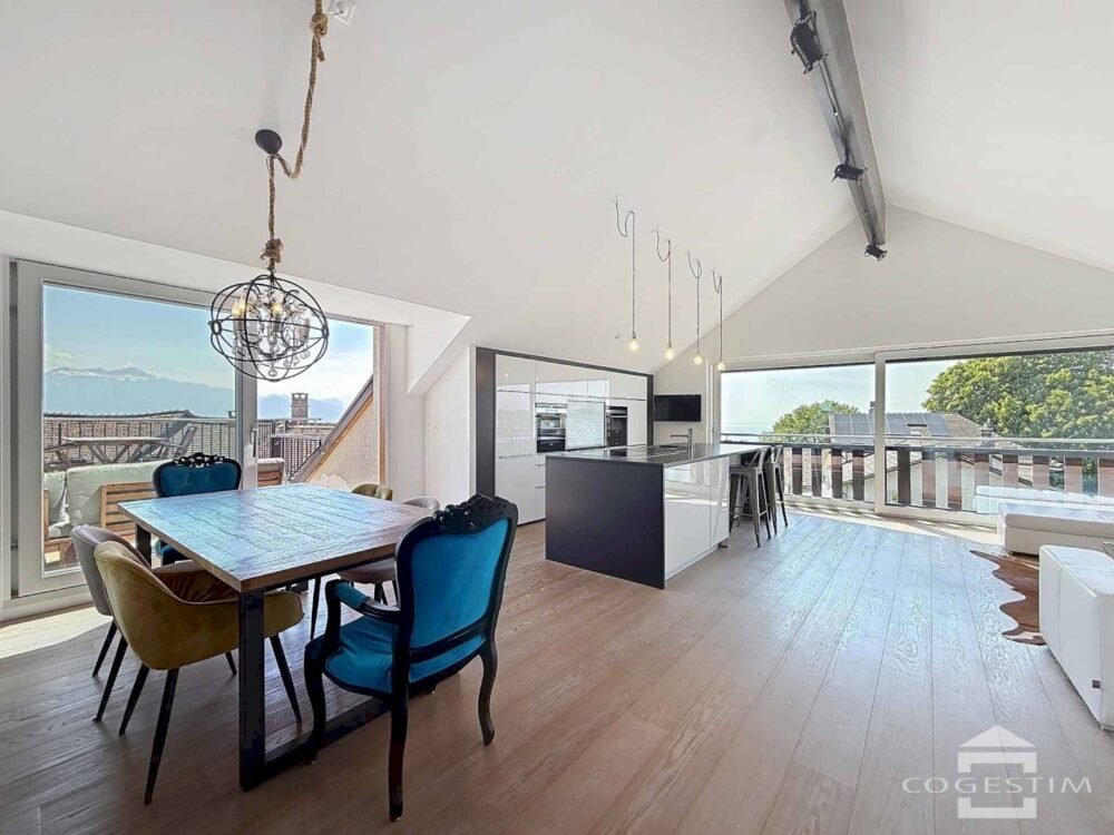 Réparti entre le 2ème étage et les combles, il offre des volumes généreux et une belle luminosité. L’espace de vie sous toiture, avec sa hauteur sous plafond remarquable, s’ouvre sur une terrasse privative bénéficiant d’une magnifique vue sur le Lac Léman et les Alpes.
