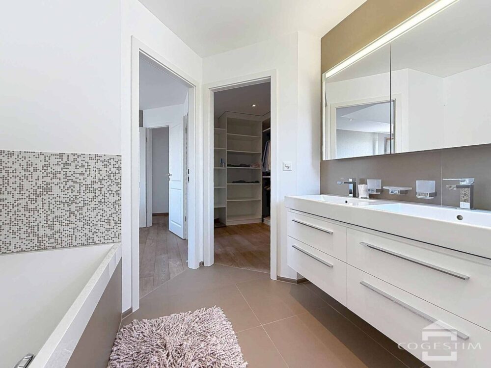 La cuisine ouverte, moderne et entièrement équipée, dispose d’un îlot central en pierre naturelle et d’équipements de qualité. L’appartement propose quatre chambres et comprend plusieurs salles d’eau, dont une suite parentale avec dressing et salle de bains complète, garantissant un confort optimal pour une famille.