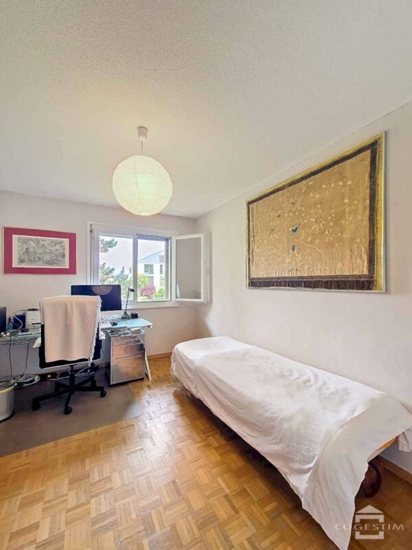 Accessible par un escalier depuis l’entrée principale, cet appartement de 3,5 pièces s’étend sur plus de 82 m² de surface habitable. Avec ces deux chambres à coucher, l’une d’entre elle bénéficiant de son balcon privatif, il représente une opportunité idéale pour un couple ou une petite famille désirant créer un cocon des plus cosy.