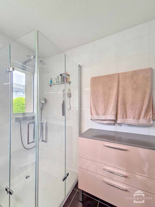L’appartement que nous vous proposons est situé au premier étage d’une petite propriété par étage totalisant 6 logements. Localisé dans les hauts de la commune, l’immeuble a été érigé sur une grande parcelle richement arborée.