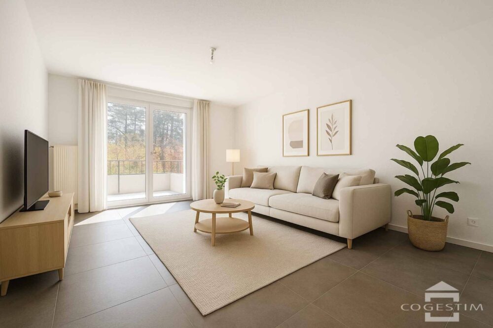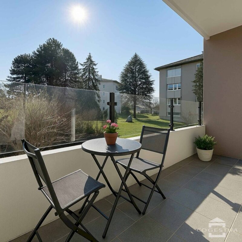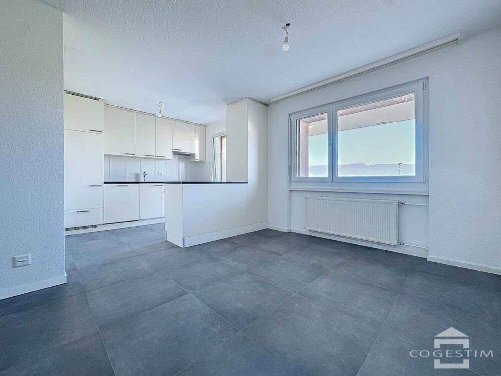 L’espace de vie, lumineux et moderne, s’ouvre sur une cuisine entièrement équipée donnant accès à un balcon de 14.7 m² avec échappée sur le lac. Le séjour spacieux bénéficie également d’une terrasse de 5.1 m². L’appartement comprend trois chambres confortables, une salle de bains moderne et un WC visiteurs.