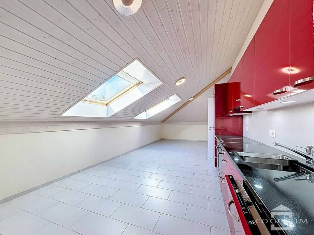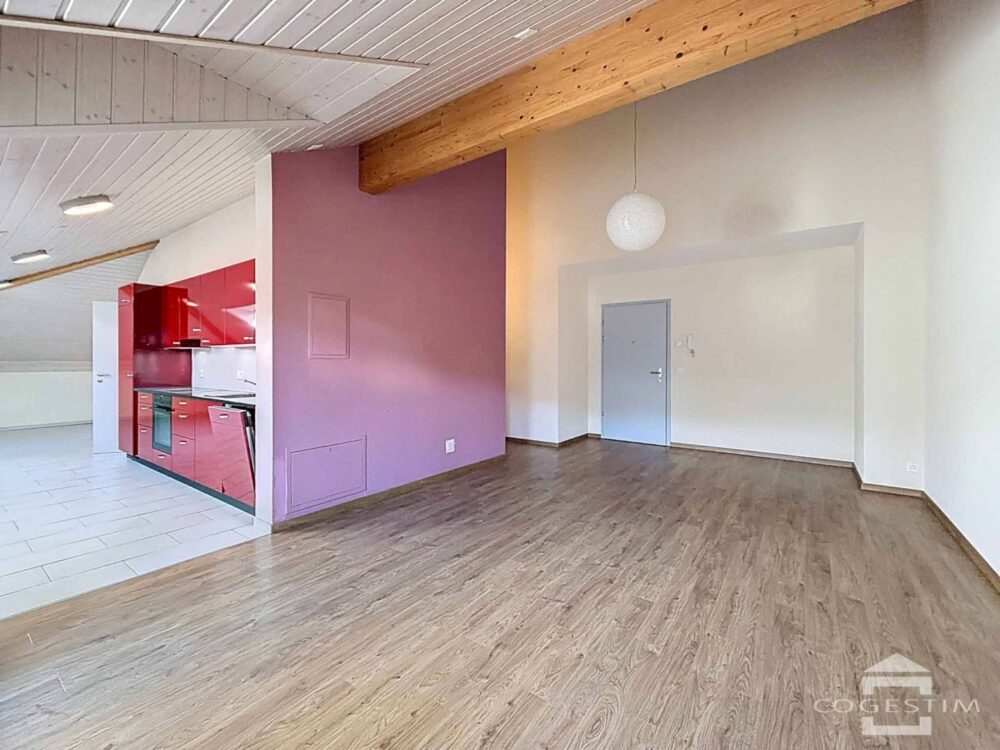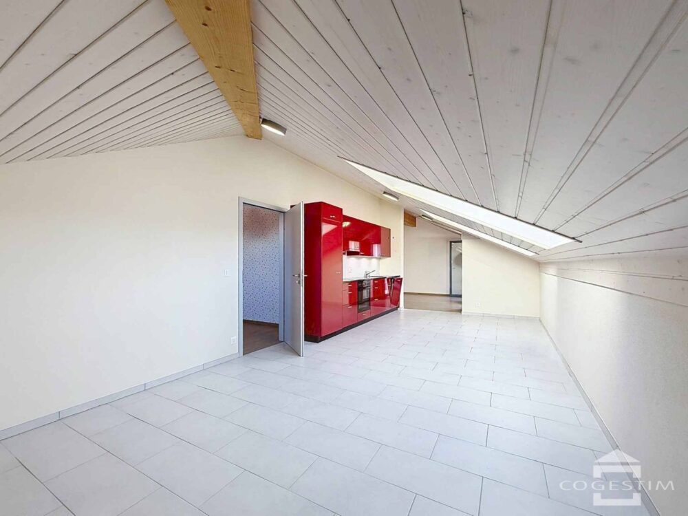 Installé au dernier étage, il offre un bel espace mansardé bénéficiant d’une luminosité généreuse grâce à de grandes ouvertures. La pièce de vie principale, avec sa cuisine ouverte, s’ouvre sur un balcon offrant une vue dégagée sur les environs. La chambre est confortable et la salle de bains équipée d’une douche.