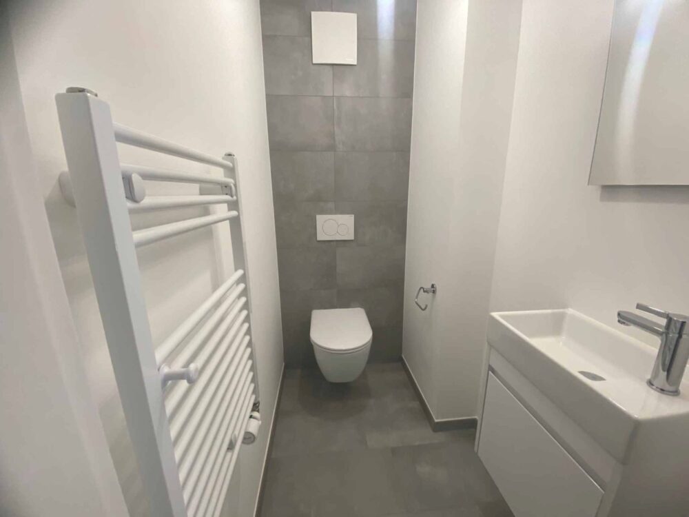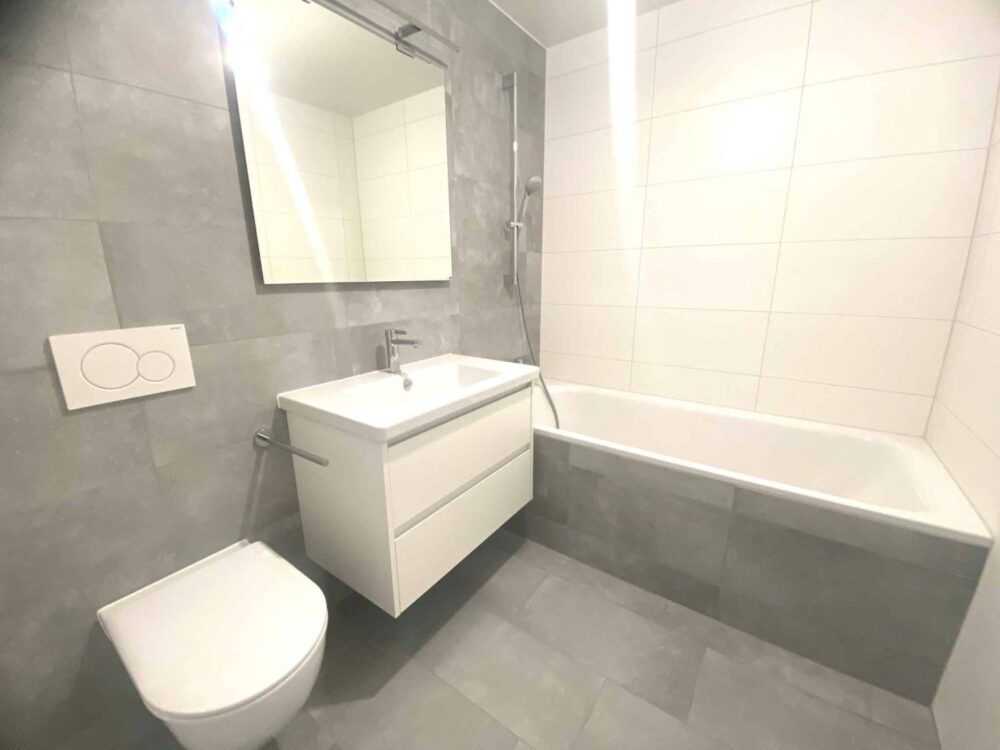 Rénové avec goût et avec des matériaux contemporain, parquet au sol, 2 chambres à coucher, 1 salle de bains, 1 WC/lavabo séparé, cuisine ouverte entièrement équipée avec de l’électroménager Siemens, donnant sur un grand séjour/salle à manger, prolongé par un balcon, vue dégagée sans vis-à-vis.