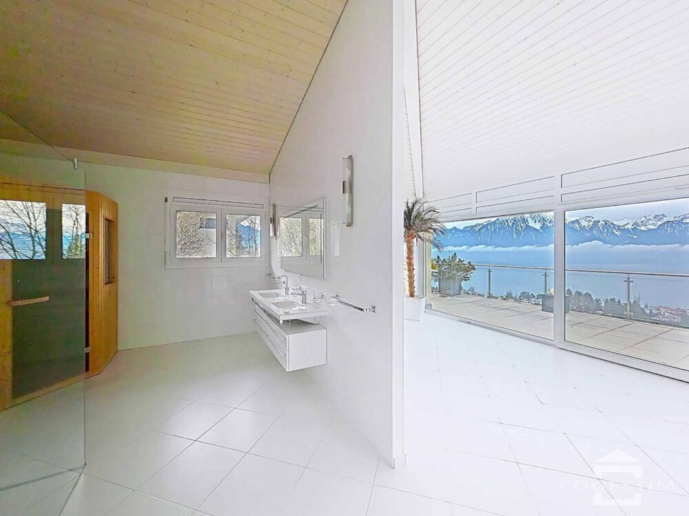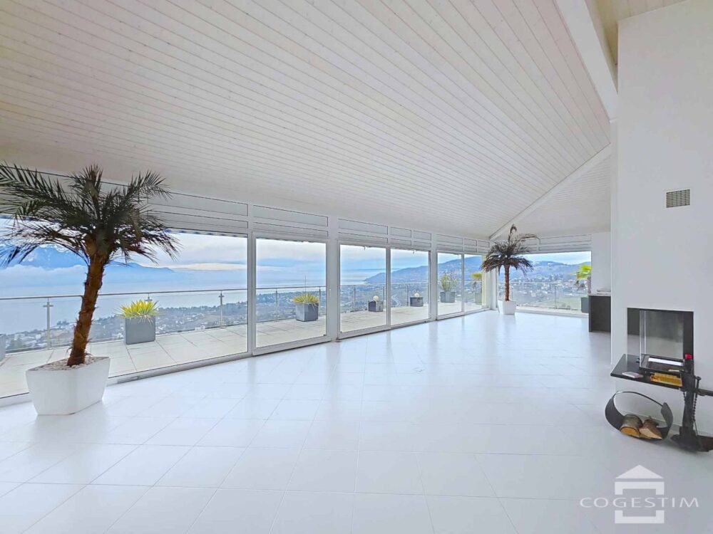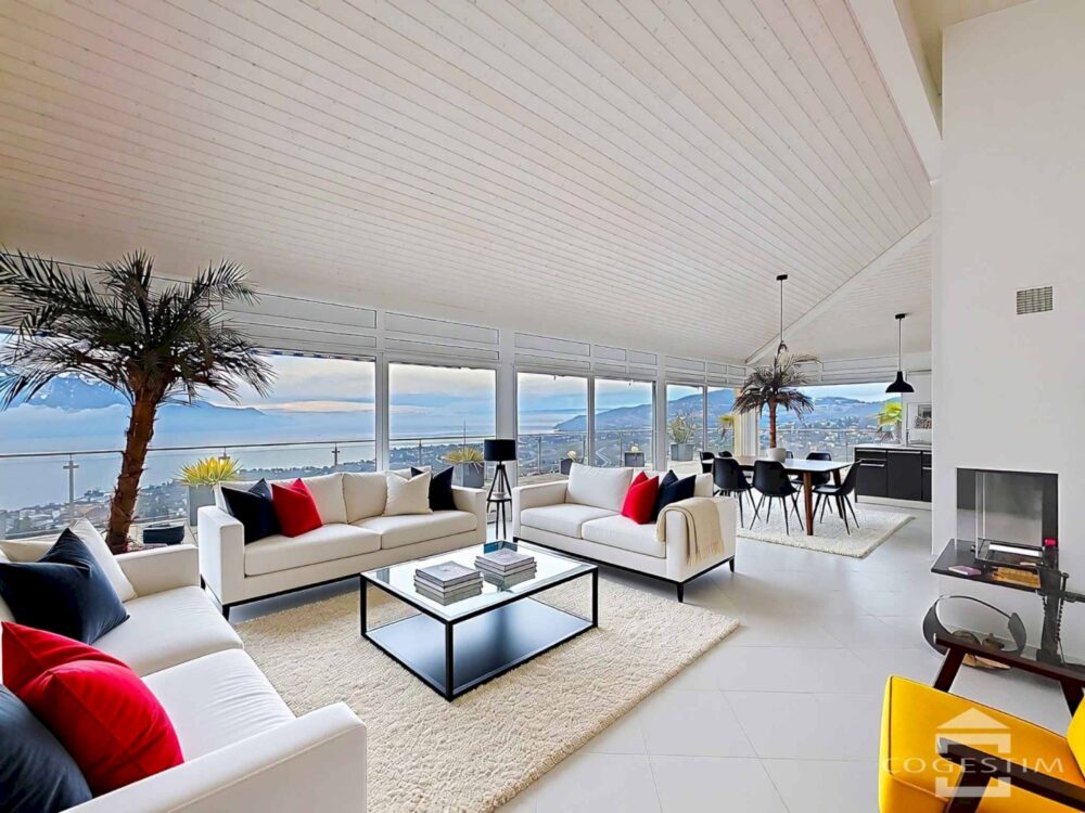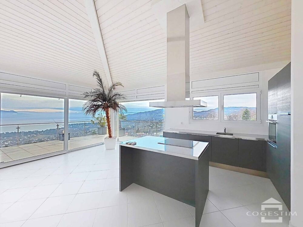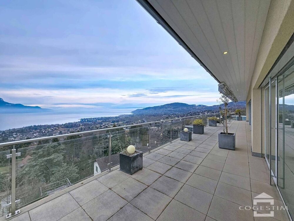 La pièce de vie impressionne par ses volumes généreux et sa luminosité exceptionnelle. De larges baies vitrées s’ouvrent sur une vaste terrasse panoramique offrant une vue époustouflante sur le lac Léman et les Alpes. Le panorama est dégagé et dominant, offrant un spectacle permanent en toute saison.