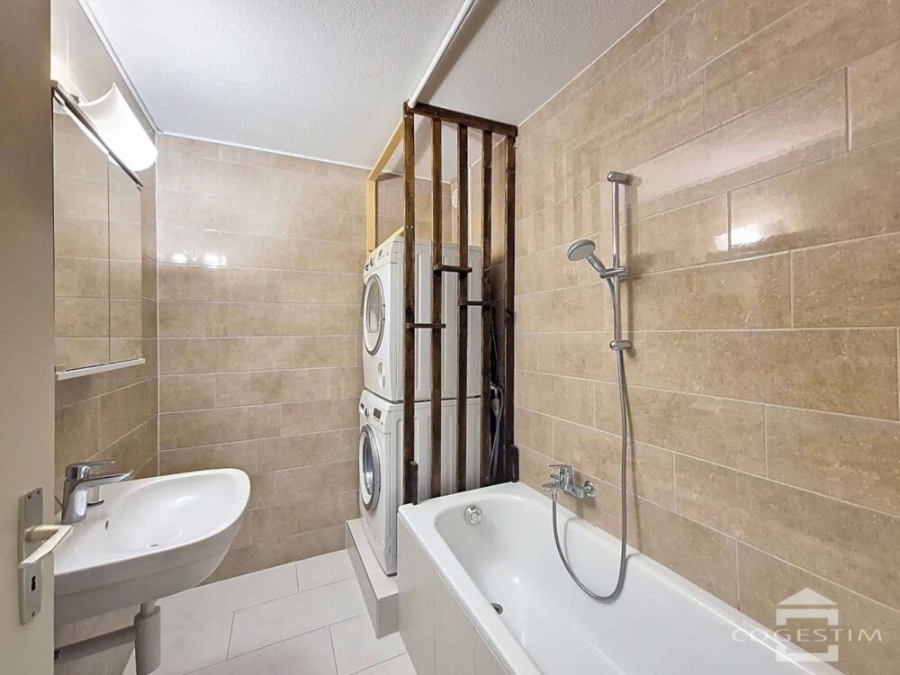 D’une surface habitable d’environ 85 m², le logement séduit par ses volumes bien distribués et sa luminosité. La pièce de vie comprend un séjour convivial avec accès direct au balcon de 10.7 m2, ainsi qu’une cuisine ouverte fonctionnelle. L’appartement dispose de deux chambres confortables, d’une salle de bains et d’un WC séparé, offrant un agencement idéal pour un couple, une petite famille ou un investisseur.