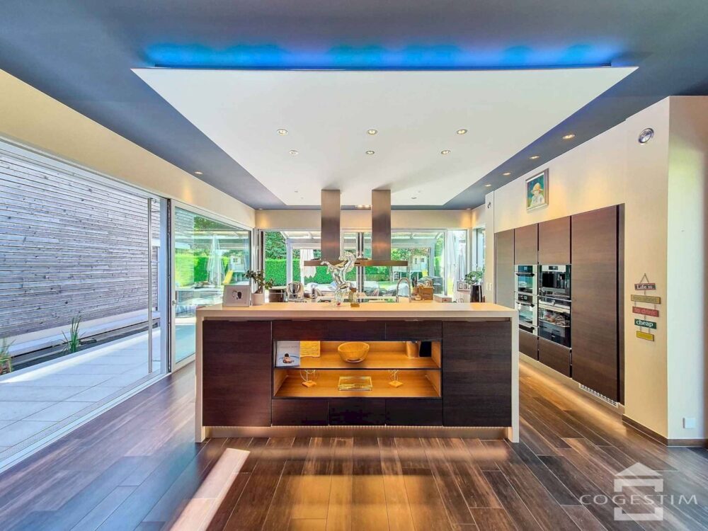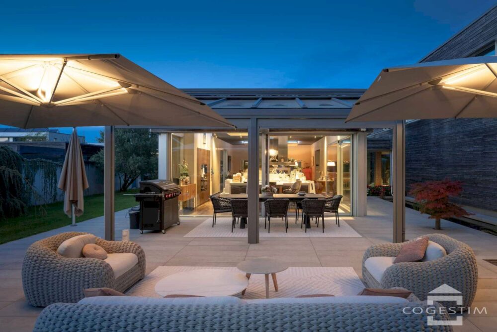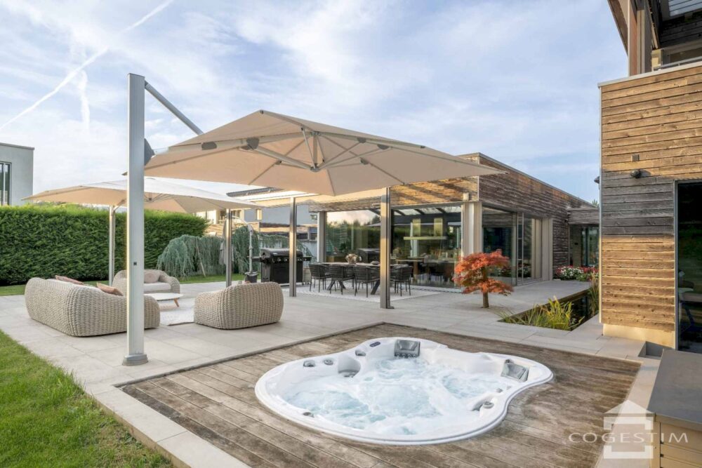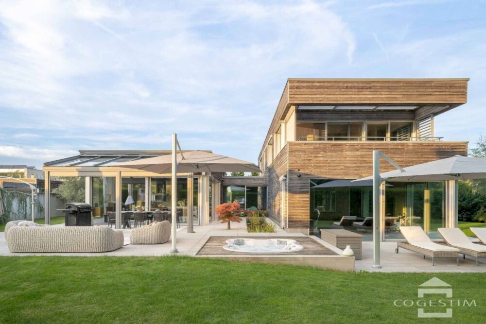 Les vastes terrasses couvertes prolongent les espaces de vie vers l’extérieur, invitant à la contemplation et aux réceptions en plein air. Le parc paysager offre une succession d’ambiances végétales qui évoluent au fil des saisons.