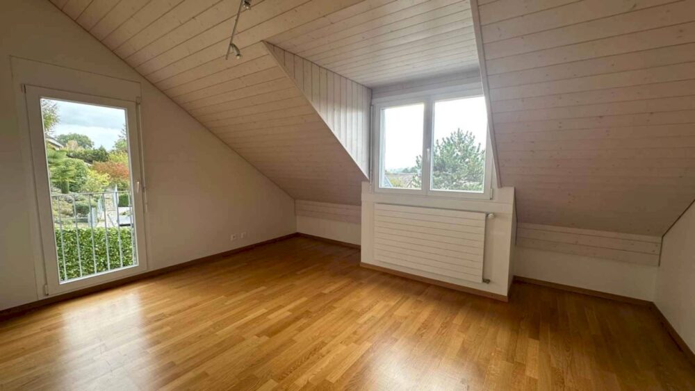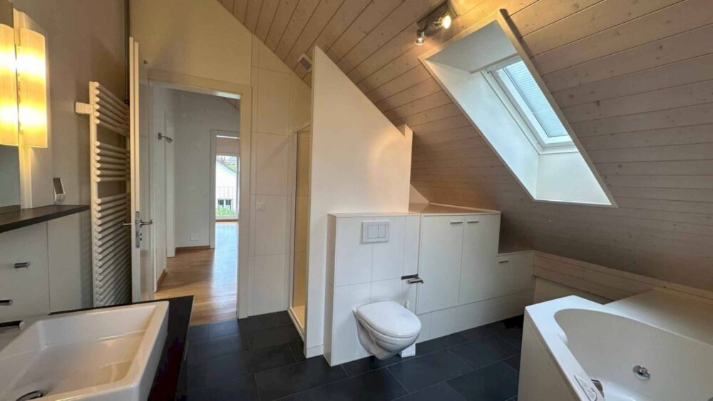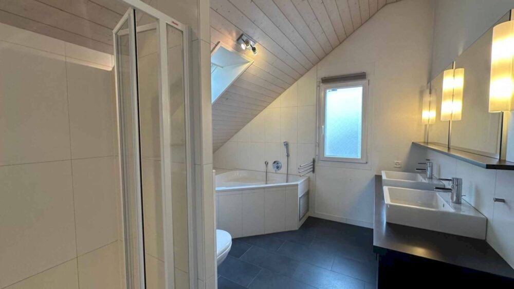 A l’étage 3 chambres à coucher en parquet, dont une chambre avec salle de bains/baignoire/jacuzzi , douche et wc.