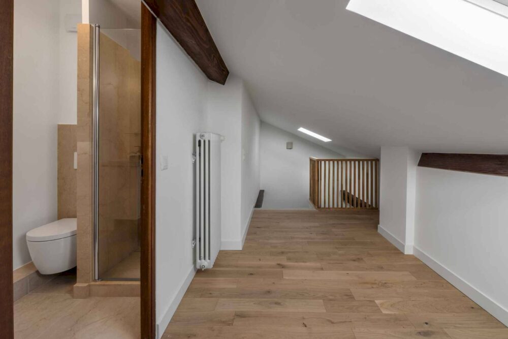 Les deux premiers étages sont aménagés chacun avec une grande chambre à coucher et une salle de bains complète. Le dernier niveau accueille une chambre mansardée avec sa salle de douche complète.