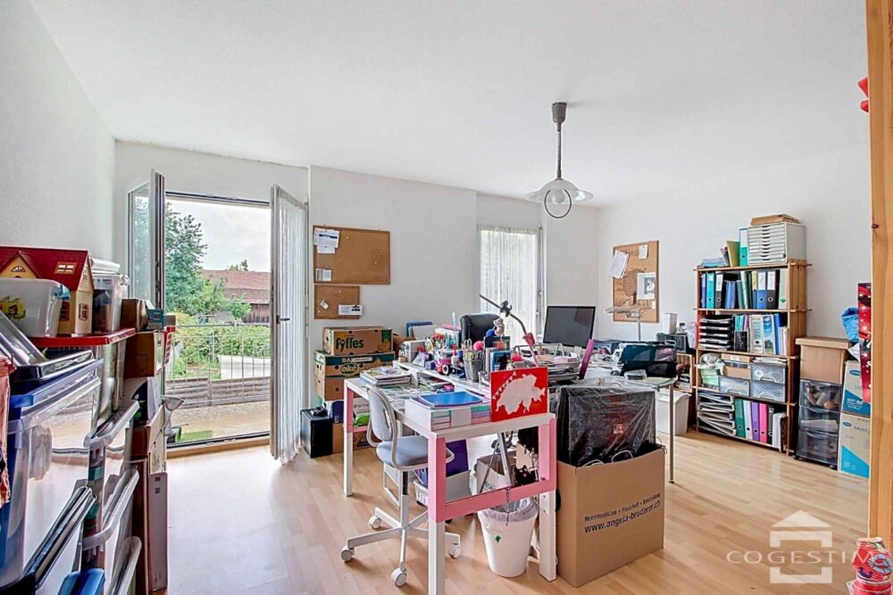 L’intérieur, réparti sur deux niveaux, propose un vaste séjour avec poêle suédois, une cuisine ouverte entièrement agencée, 5 chambres, une salle de bain complète, un WC séparé, ainsi que des espaces supplémentaires au sous-sol (locaux techniques et disponibles). Les combles abritent un galetas accessible par trappe.