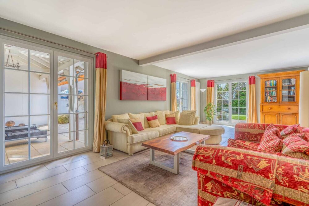 À l’extérieur, le jardin paysager soigneusement aménagé prolonge les espaces de vie dans un environnement verdoyant, sans vis-à-vis direct. Terrasse, espaces de détente et jacuzzi offrent un véritable cadre de bien-être au quotidien.