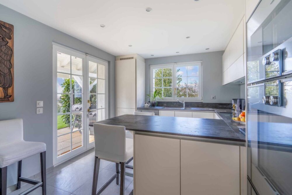 La cuisine, entièrement rénovée avec des équipements haut de gamme, s’intègre parfaitement à l’ensemble et répond aux exigences actuelles en matière de confort et de fonctionnalité.