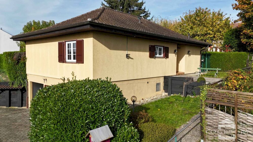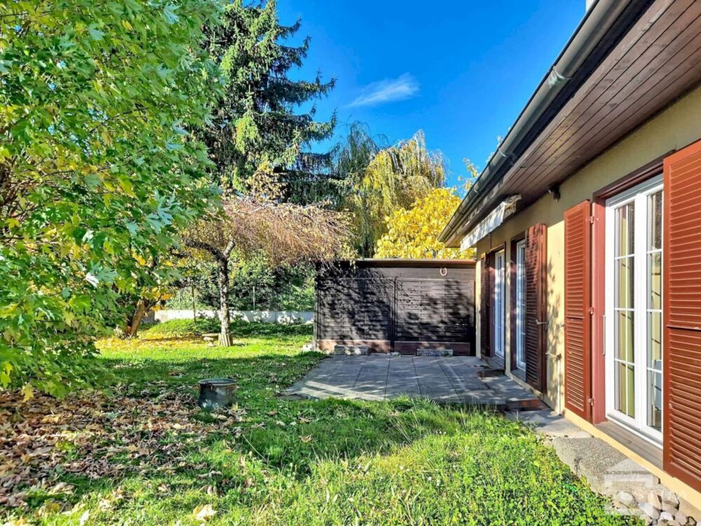 Cette villa offre une surface habitable de plus de 130 m², actuellement distribués sur deux logements. Le rez-de-chaussée est intégralement occupé par l’appartement principal de 4 pièces composé d’un séjour, d’une cuisine fermée, de trois chambres, d’une salle de bain et d’un WC visiteur. Un studio indépendant d’env. 30 m² avec kitchenette et salle de douche / WC occupe le niveau inférieur de la bâtisse.