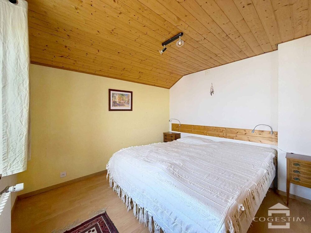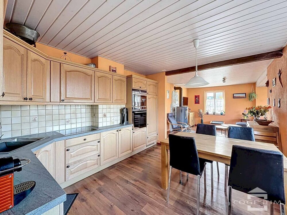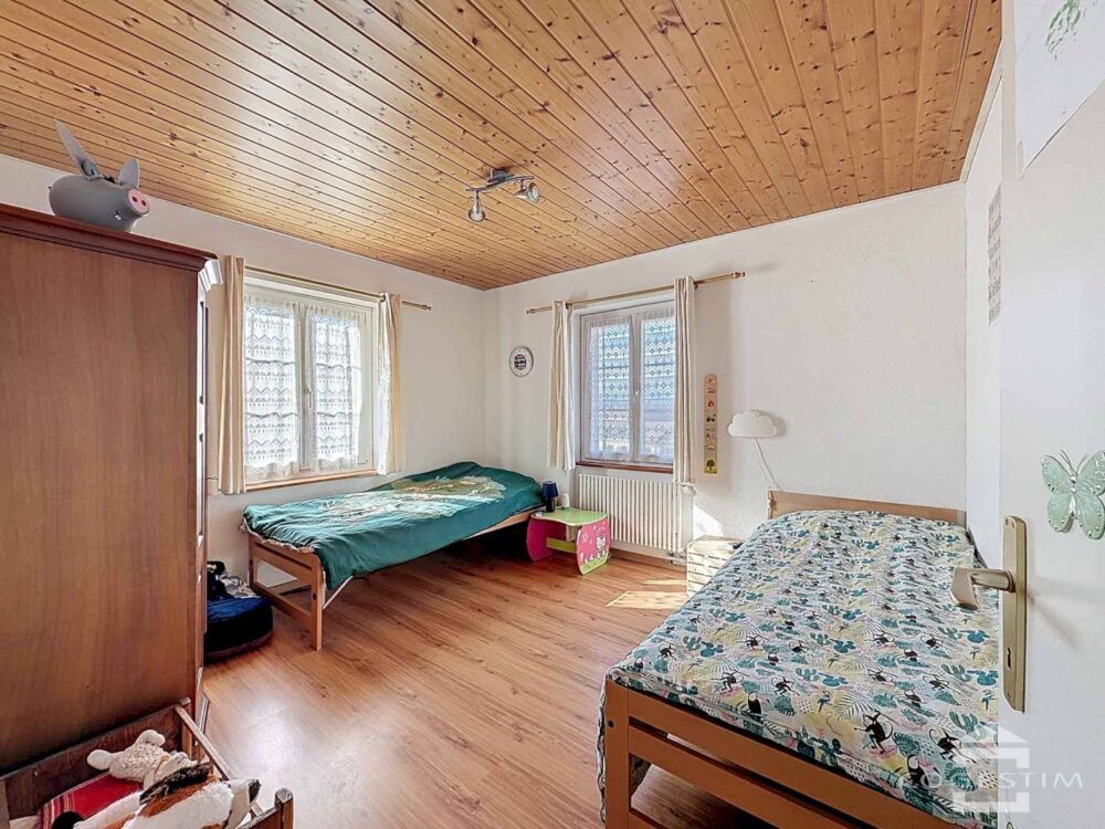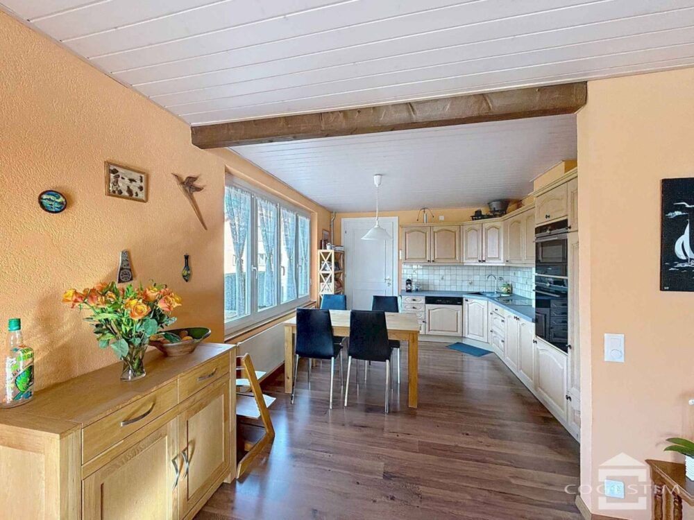 Répartie sur deux niveaux et un sous-sol, elle comprend une cuisine ouverte sur la salle à manger, un séjour avec poêle, une chambre avec salle d’eau et un accès direct sur la terrasse. L’étage dispose de trois chambres, d’une salle de bains et d’un galetas.