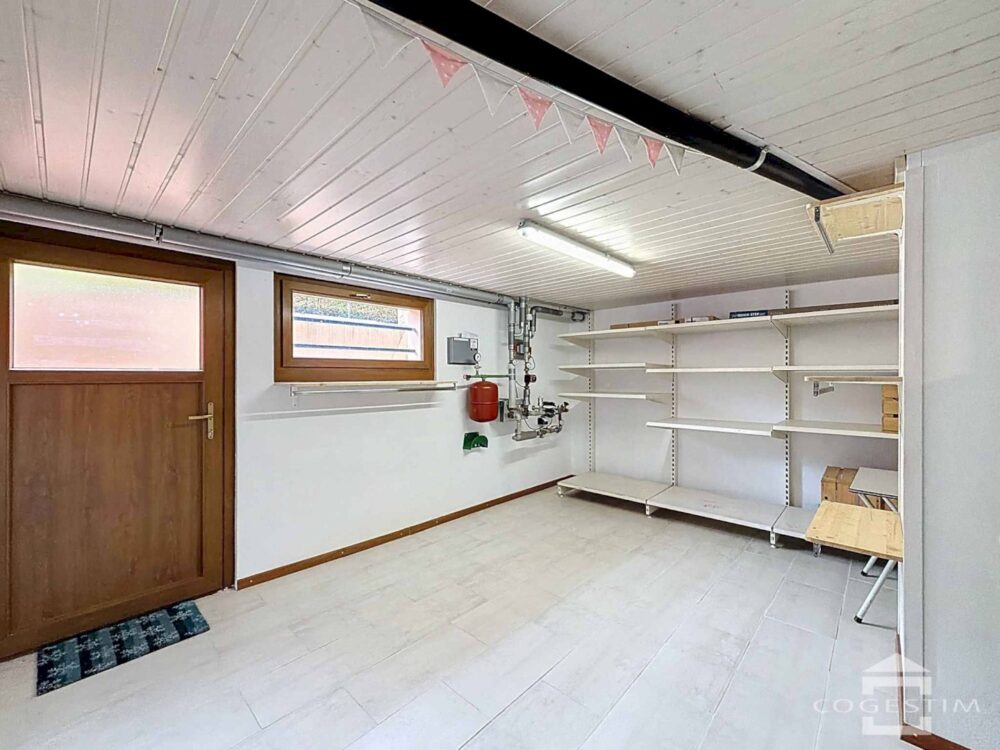 Le sous-sol abrite une buanderie, une cave et un disponible pouvant convenir à une activité indépendante ou à un espace polyvalent selon les besoins. À l’extérieur, un espace arboré, un atelier et plusieurs places de parc complètent l’ensemble.