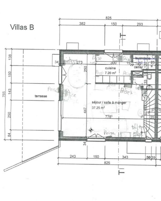 Le rez-supérieur offre un espace lumineux comprenant un séjour avec cheminée, une cuisine ouverte entièrement équipée, une buanderie / cellier, un toilette invité ainsi qu’une terrasse exposé Ouest.