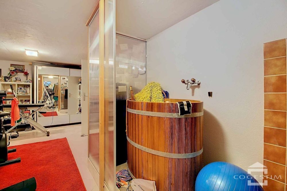 Le sous-sol dispose d’une salle de jeux, d’un sauna joliment aménagé avec bac d’eau froide et douche, d’une cave à vin avec sol en gravier, buanderie, local technique avec système anticalcaire électrique, bouilleur électrique et rangement sous escalier. Une description détaillée se trouve en page suivante.