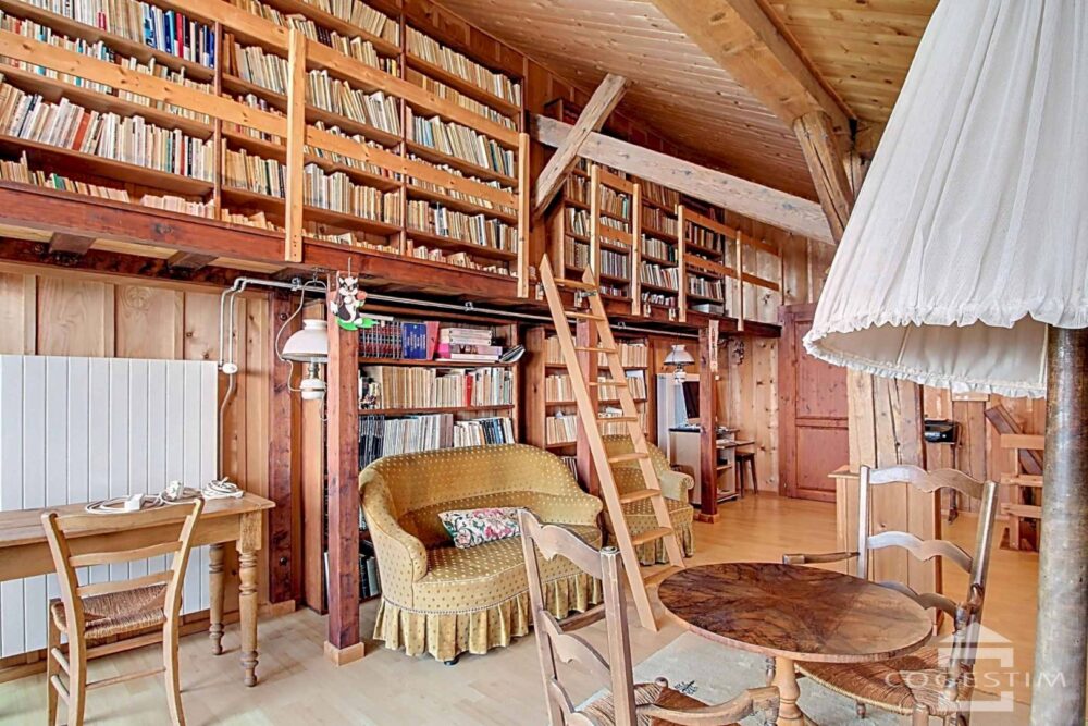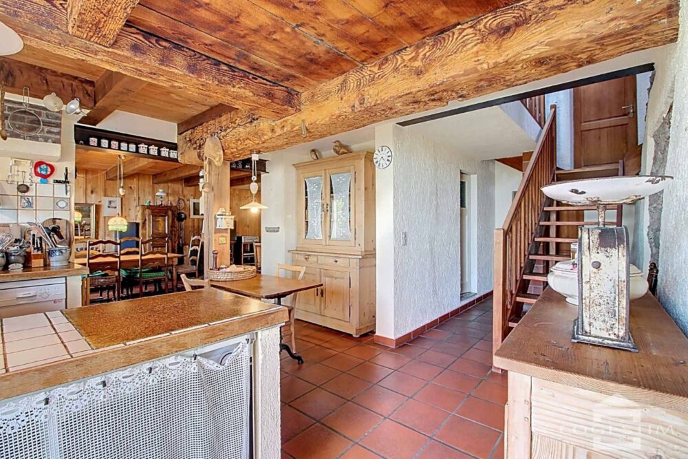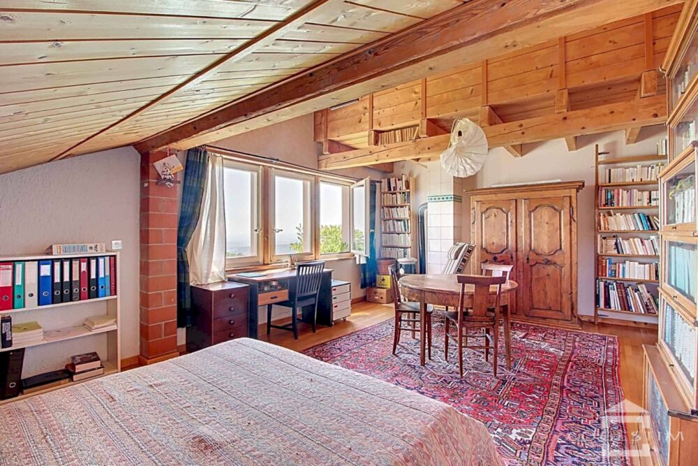 La maison comprend plusieurs pièces aux usages multiples, dont un grand séjour lumineux avec poêle, une cuisine équipée avec accès extérieur, des chambres confortables, une salle de bains et une salle d’eau, ainsi qu’un espace bibliothèque avec balcon panoramique. Les combles, partiellement aménagés, offrent un potentiel d’extension intéressant. Une grange avec atelier, un garage intégré et une place de parc extérieure complètent l’ensemble.