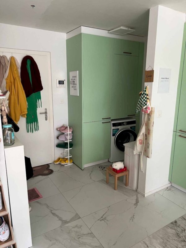 - ein Eingangsbereich mit Wandschränken und Platz für einen Waschtrockner