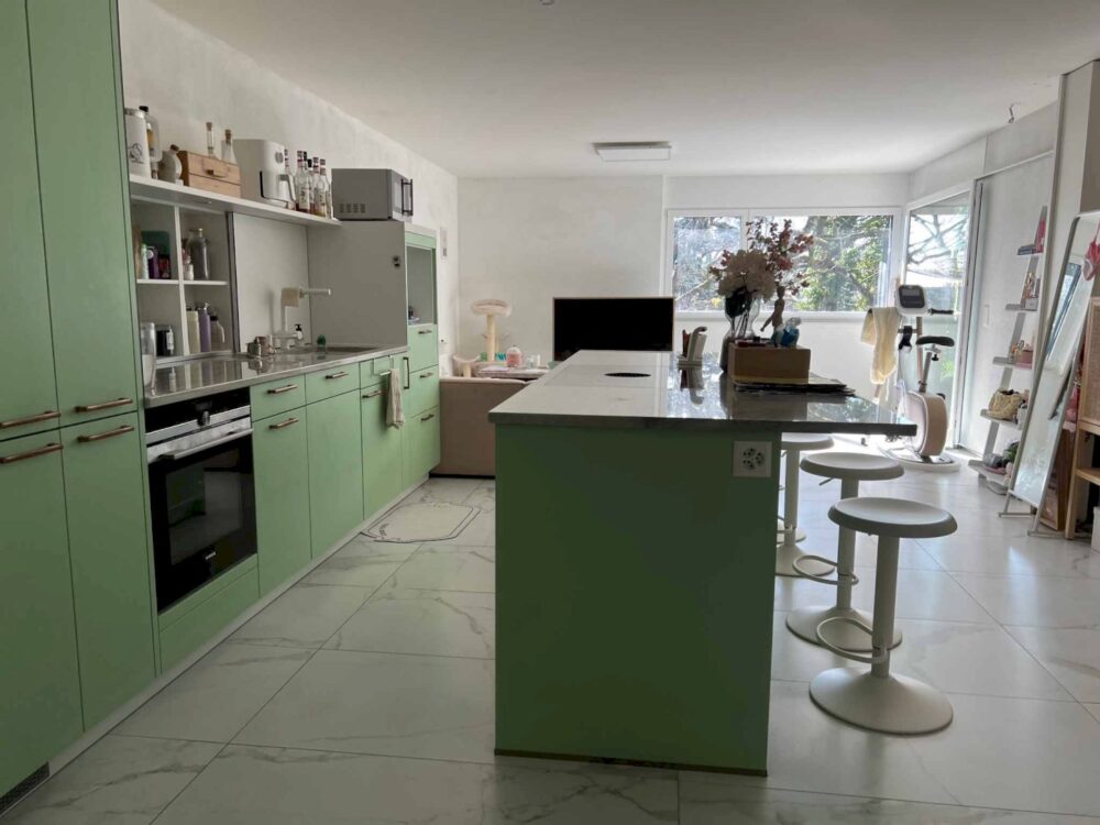 - eine schöne, komplett eingerichtete Küche mit zentraler Kochinsel, die zum Wohnzimmer hin offen ist