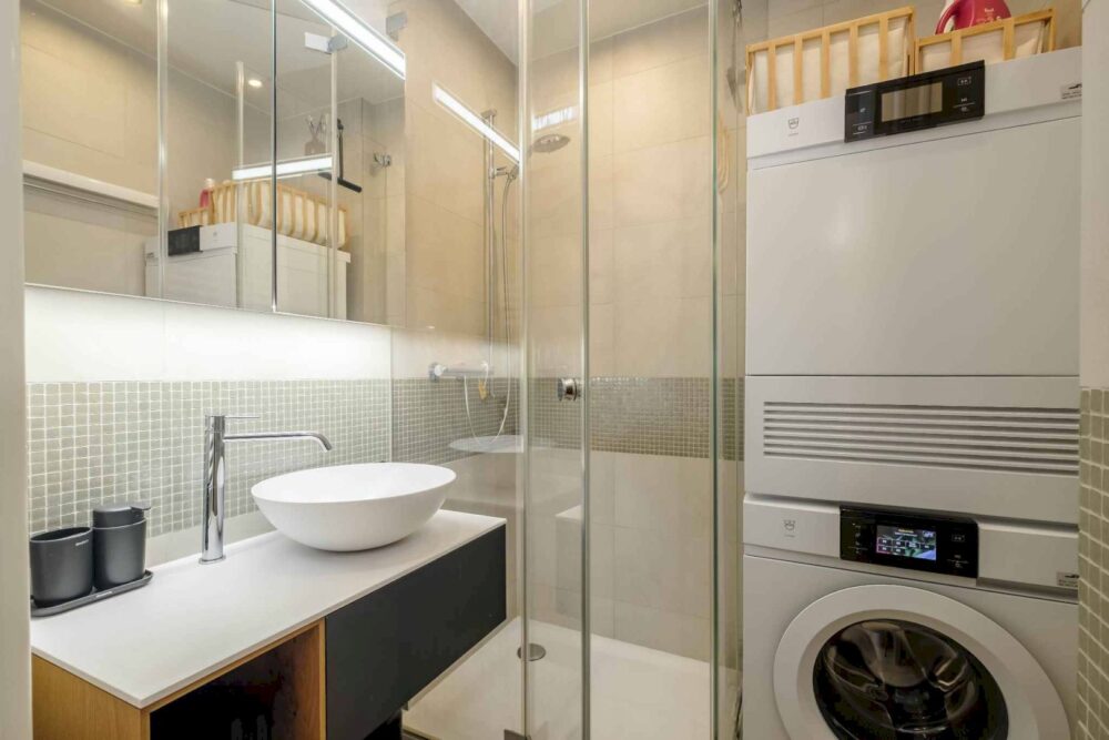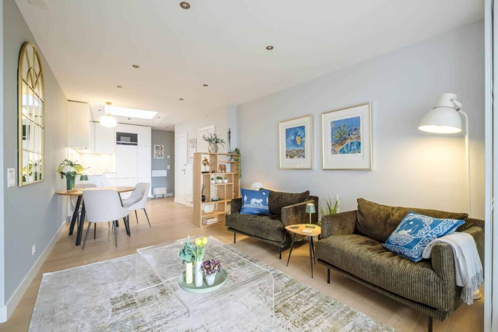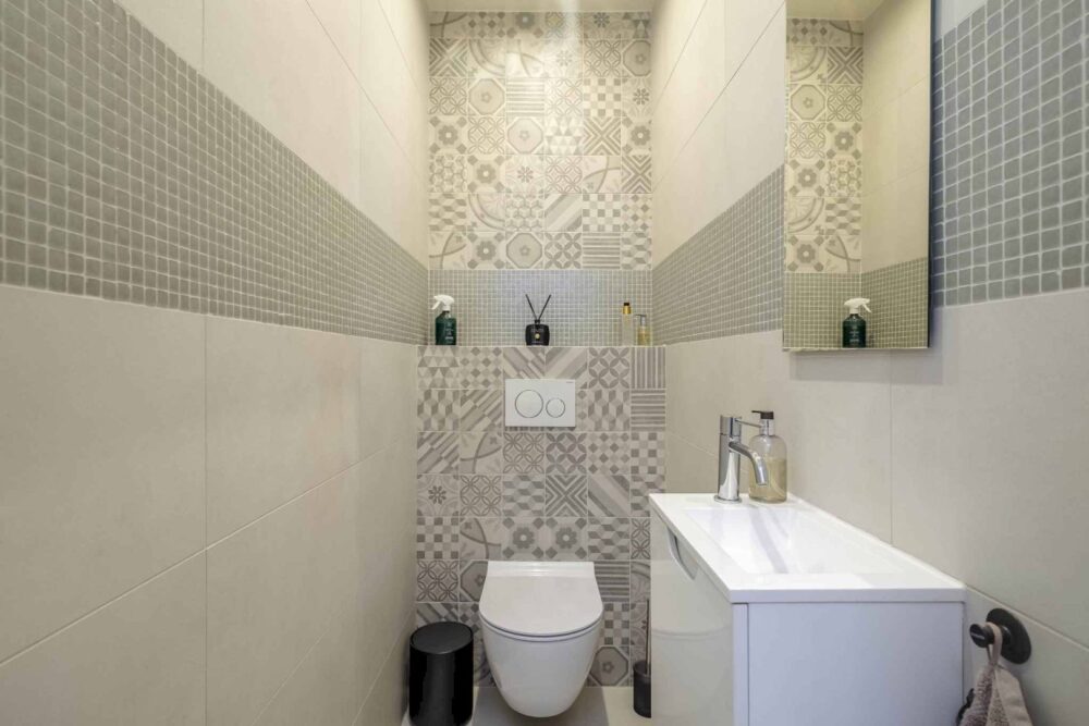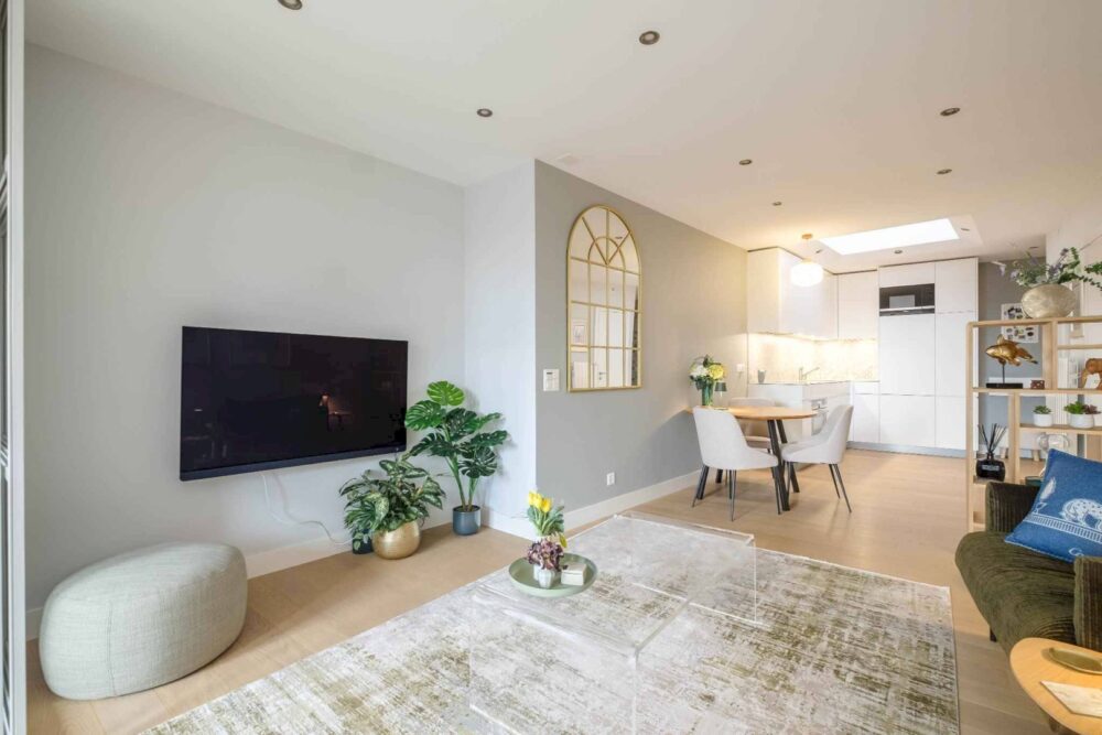The flat was completely refurbished in 2019 using top-quality materials. It comprises: entrance hall with cloakroom, fully equipped kitchen with automatic overhead lighting opening onto the living room, bedroom with wall-mounted bookcase, shower room with washbasin and separate toilet with washbasin.
