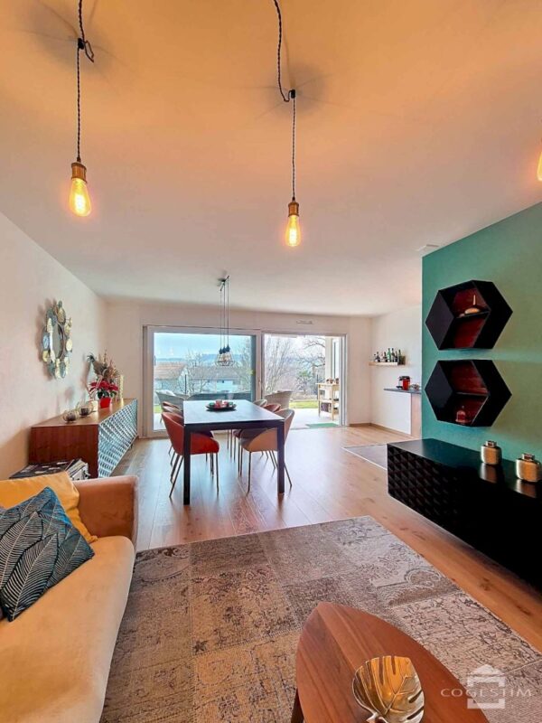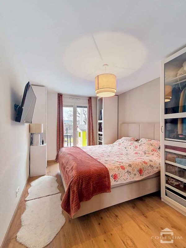 Accessible on one level via the main entrance or from the underground car park via a staircase and lift, this home offers almost 90 m² of living space and comprises 3.5 rooms. The optimal layout of these rooms has been designed to clearly distinguish between day and night areas. Facing due south, the living room and bedrooms enjoy comfortable spaces and plenty of natural light thanks to the large windows.