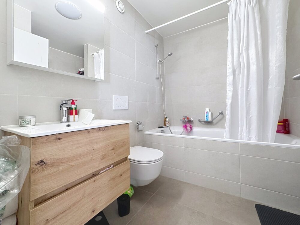 – a bathroom with WC and bath + washbasin provided