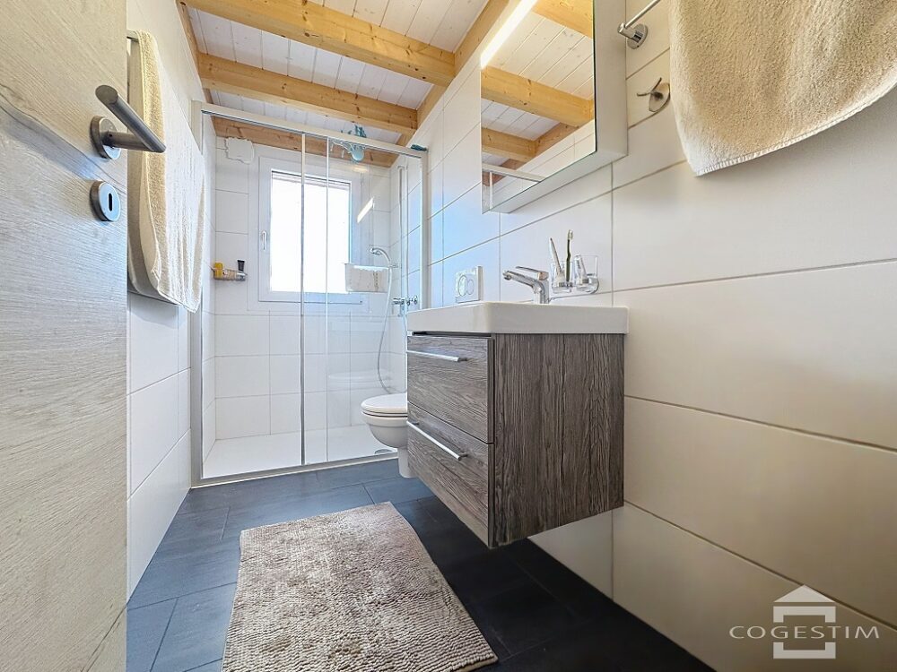 – une salle de bain avec WC et douche