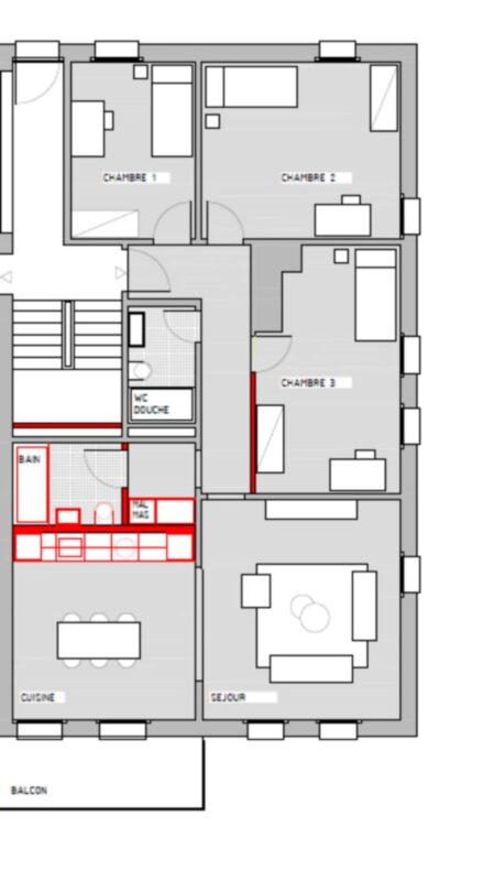 Rénové avec goût et avec des matériaux contemporain, parquet au sol, 3 chambres à coucher, 1 salle de douche, 1 salle de bains, colonne de lavage/séchage, cuisine ouverte entièrement équipée avec de l’électroménager Siemens, donnant sur un grand séjour/salle à manger, prolongé par un balcon, vue dégagée sans vis-à-vis.