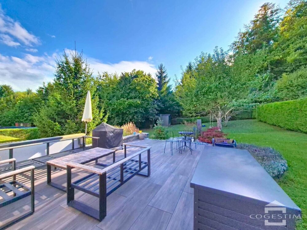 Das Wohnzimmer öffnet sich zu einer großen Terrasse von 40 m² und einem wunderschönen Privatgarten von ca. 840 m², der sorgfältig angelegt wurde und eine schöne Privatsphäre bietet.