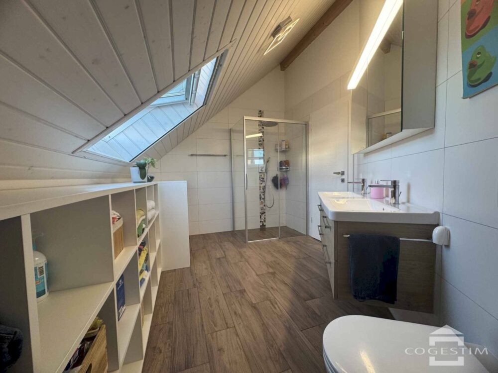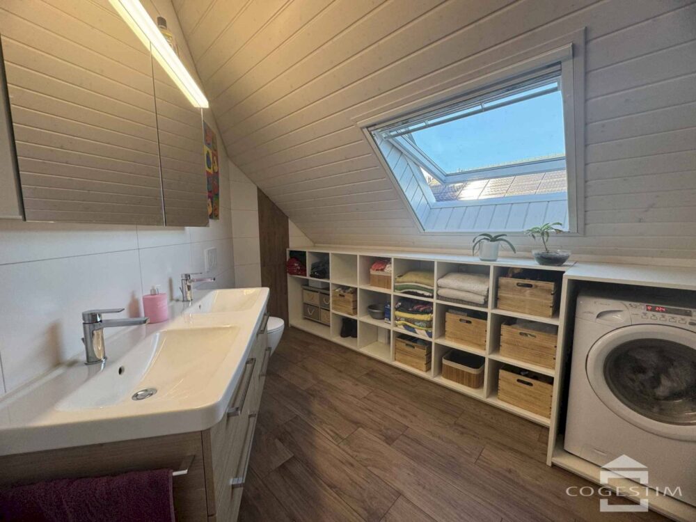 Im Obergeschoss bietet das Zwischengeschoss einen Mehrzweckraum, der als Büro oder Sportraum genutzt werden kann. Ein privater Keller befindet sich im Untergeschoss.