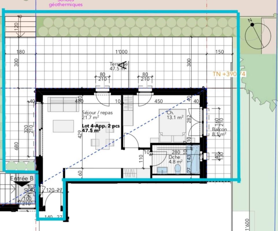 The living room boasts a large west-facing bay window, providing plenty of natural light. The bedroom has a surface area of over 13 m2 with several openings onto the terrace, and the shower room is naturally ventilated by a window.