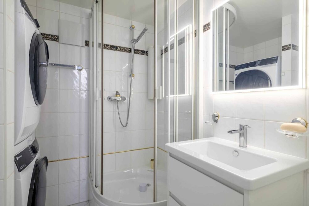 Bright and functional, the living area comprises a spacious living room with fireplace, a dining room and a fully-equipped kitchen with dining area and direct access to the terrace.