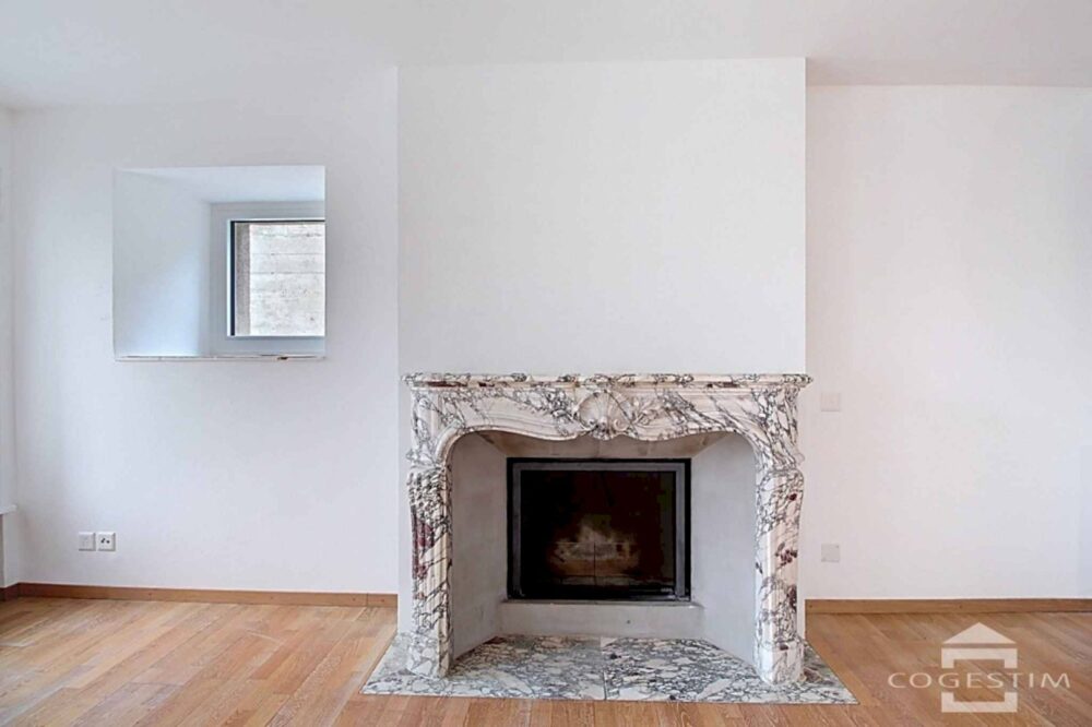 Le vaste séjour, baigné de lumière naturelle, est sublimé par une cheminée en marbre, créant une atmosphère chaleureuse et raffinée. La cuisine, indépendante et spacieuse, s’avère un lieu privilégié pour des moments conviviaux, tandis qu’un espace bureau/bibliothèque se révèle parfait pour les instants de travail ou de détente intellectuelle.